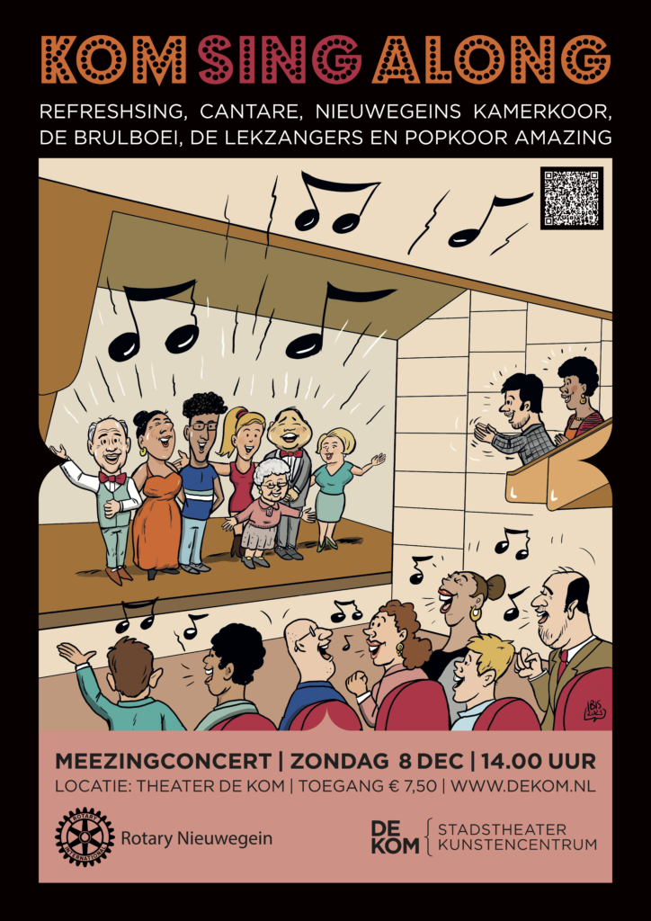 Iets heel anders dit keer. Het Nieuwegeins Kamerkoor treedt op tijdens de door de Rotary en theater De KOM georganiseerde KOM sing along op zondag 8 december 2024. Tijdens dit meezingconcert brengen zes Nieuwegeinse koren, naast hun eigen repertoire, een aantal bekende nummers waarbij het publiek kan meezingen of gewoon lekker achterover leunen en genieten van alle mooie samenklanken. Iedereen is welkom; van badkamerartiesten tot concertzangers. Publiek hoeft niks voor te bereiden, de teksten zijn mee te lezen op groot scherm en in het programmaboekje. KOM en Sing Along!